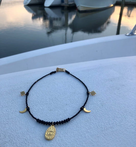 Lightning Bolt w/ Clear Crystals Strung w/ Black Seed Beads & Tiger's Eye