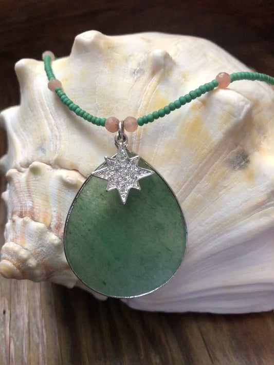 Green Aventurine & Clear Crystal Morningstar Pendant Strung w/ Peach Sunstone & Green Glass Seed Beads