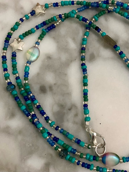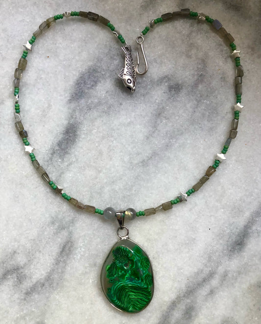 Green Moss Agate Pendant Strung w/ Labradorite, Silver Stars, & Green Glass Seed Beads