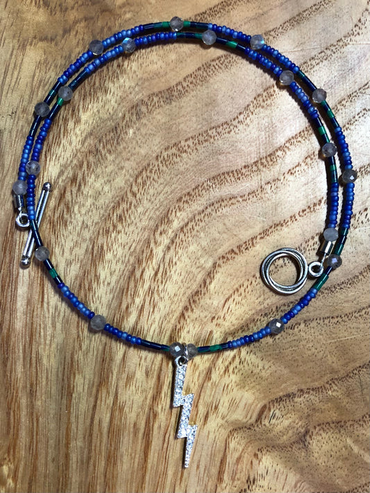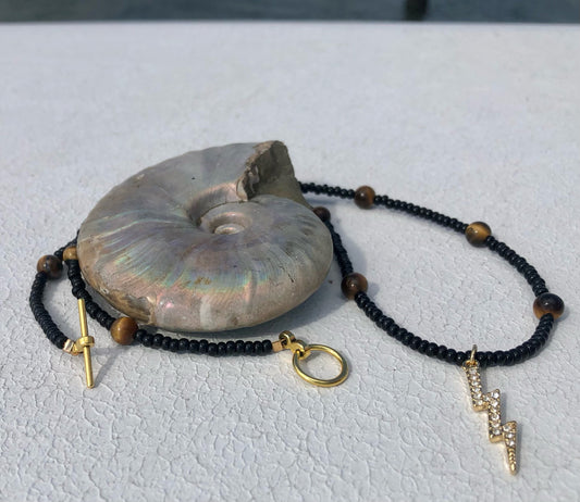 Lightning Bolt w/ Clear Crystals Strung w/ Black Seed Beads & Tiger's Eye