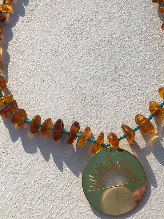 Sunrise Pendant Strung w/ Natural Amber & Turquoise Glass Seed Beads