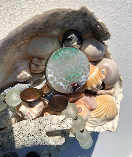 Faceted Fire Agate Pendant w/ Freshwater Coin Pearls & Recycled Glass Beads
