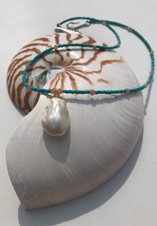Natural Baroque Pearl, Sunstones, & Turquoise Glass Seed Beads