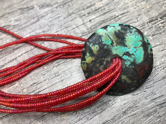 Turquoise Donut Pendant Strung on 8 Strands of Red Glass Seed Beads