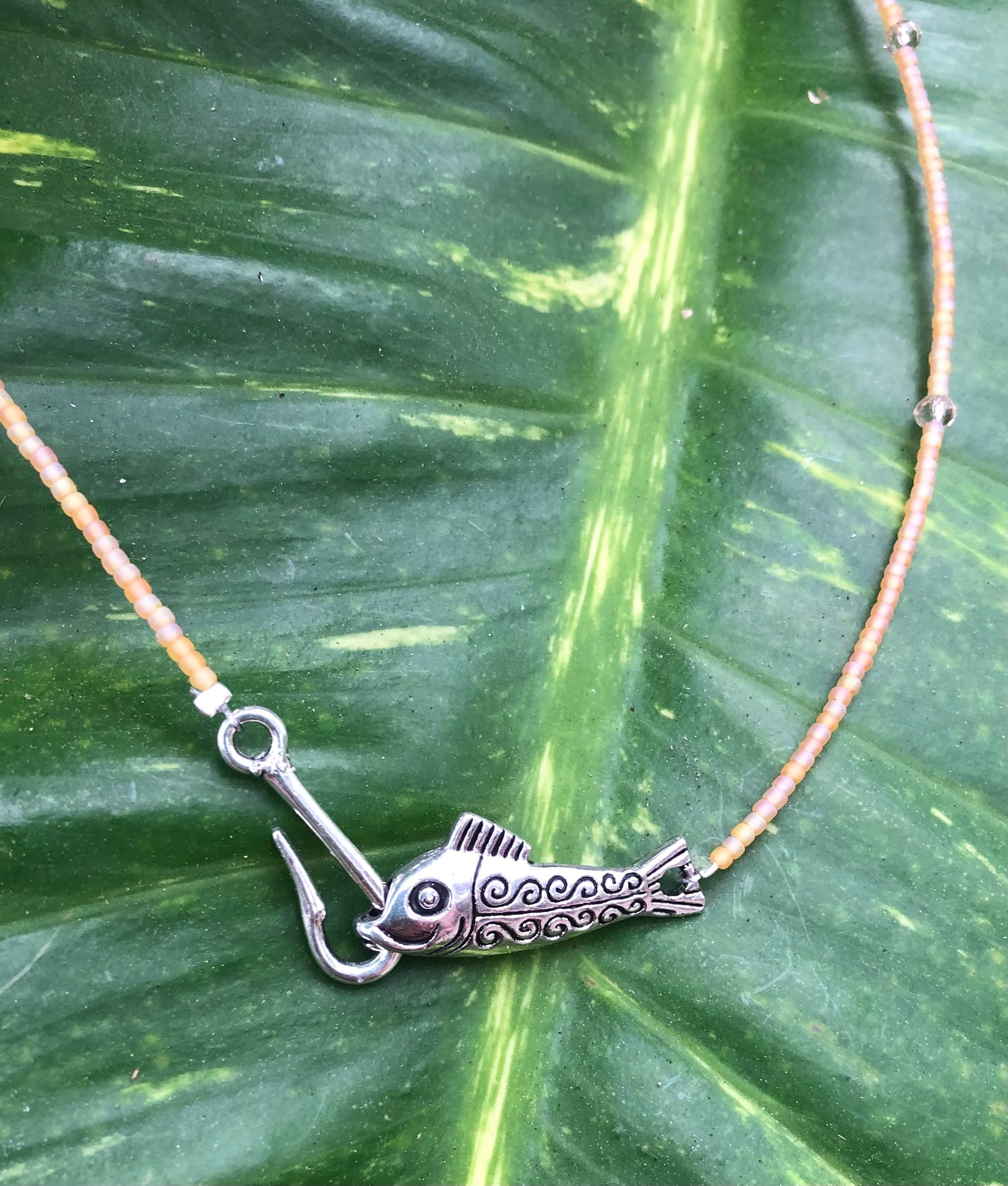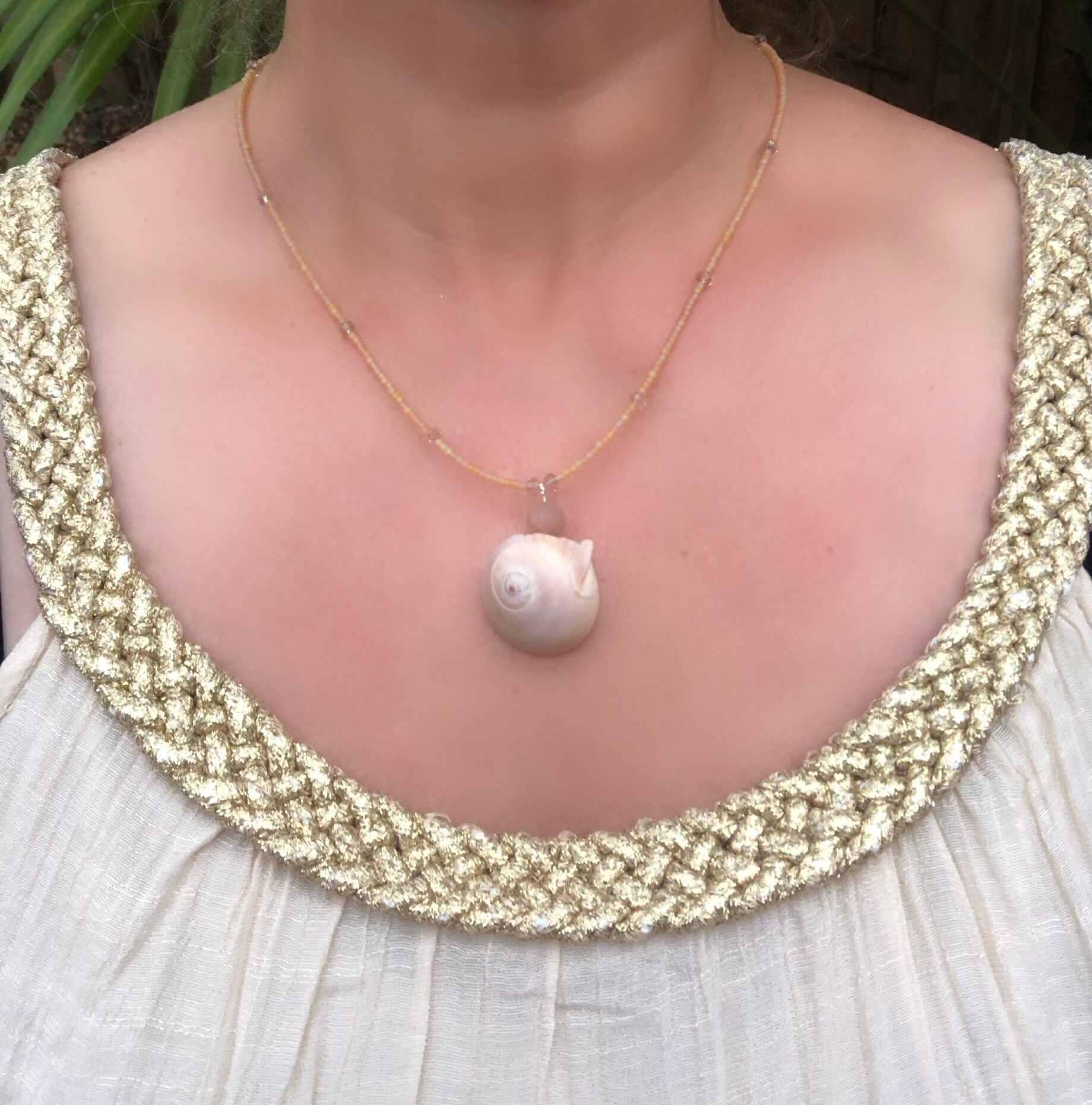 A peach sunstone sitting atop this pretty in light pink seashell measuring approx. 1" is ready to surf and swim with you! Strung with peach and pink glass seed beads and peach Austrian crystals this necklace measures about 18.5".